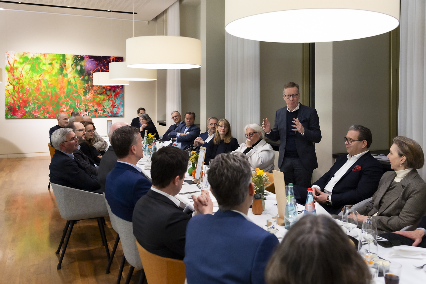 Trotz eisglatter Straßen haben sich 30 CEOs am Abend des 5. Februar im Restaurant der ESMT Berlin getroffen, um mit Prof. Dr. Michael Hüther, dem Direktor des Instituts der deutschen Wirtschaft (IW) über die gegenwärtige Lage der deutschen und der Berliner Wirtschaft zu diskutieren.
