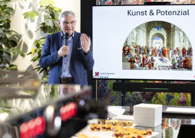 Anschließend standen Formate zur Potentialanalyse auf der Agenda, denn, wie Johannes Lotz, Senior Berater bei Hoffmann & Partner Executive Consulting, erläuterte: „Nicht die Vergangenheit zählt, sondern das Potenzial.“ Für ihn steht bei jeder Neubesetzung die Frage im Mittelpunkt: Was kann jemand leisten – nicht nur, was hat er bisher getan? Neben der klassischen Executive Review, bestehend aus Interview, Casestudy, Gesprächen mit Referenzen etc., gibt es auch kreative Potentialanalyseformate. Jörg Reckhenrich, selbstständiger Berater und Dozent an der Quadriga Hochschule, stellte vor, wie man mit „Kunstwerken als Assoziationsfläche und dritten Gesprächspartner“ Fragen zu Potentialen und Entwicklung nachgehen kann. Gemeinsam haben alle Formate, dass sie beiden Seiten, Bewerber und Unternehmen einen Mehrwert bieten und daher als Zeichen gegenseitiger Wertschätzung verstanden werden sollen. Das Unternehmen erfährt mehr über einen potentiellen neuen Mitarbeiter, der Bewerber erfährt, wo er seine Stärken und Schwächen hat und noch weiter an sich arbeiten.